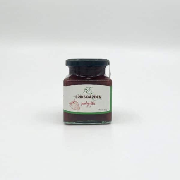 Vår egen jordgubbssylt tillverkad här på gården av vår fantastiska kökspersonal av bär från vår egen odling. För att minska matsvinnet använder vi oss av jordgubbar av B-klass, de som av olika anledningar inte kan säljas i butiken. Dessa bär använder vi oss av i all våt matproduktion.