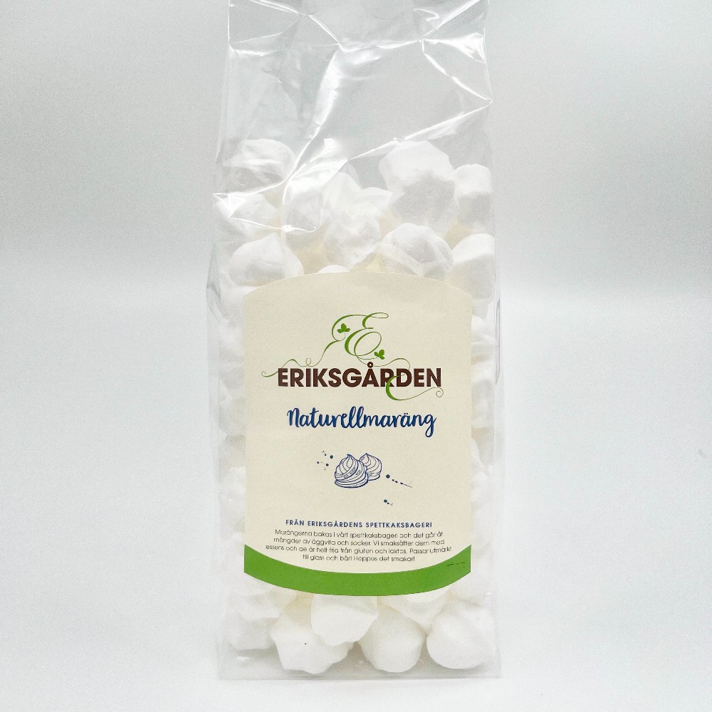 De naturella marängerna har varit med sedan vi startade vår bärbuffé 2010. På den tiden bakades dem i köket här på gården. Snart blev de så populära att vi behövde hjälp & vände oss till dåvarande Vollmers spettkaksbageri. Sedan dess bakas de på spettkaksbageriet som idag är en del av Eriksgården.
